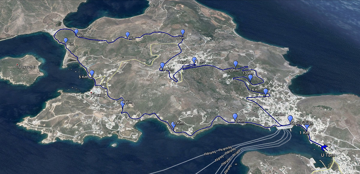 Η εκκίνηση του αγώνα 15 χλμ. θα πραγματοποιηθεί στην Σκάλα με κατεύθυνση προς την Νετιά. Πριν την μαρίνα της Νετιάς οι συμμετέχοντες επιστρέφουν στην εκκίνηση στην Σκάλα και συνεχίζουν παραλιακά προς τον Γροίκο και αμέσως μετά στην παραλία της Πέτρας. Στη συνέχεια ανηφορίζουν για την χώρα της Πάτμου, την οποία και διασχίζουν μέσα από τα σοκάκια της και τέλος αφού κατηφορίσουν προς το σπήλαιο της Αποκάλυψης, επιστρέφουν στην Σκάλα.