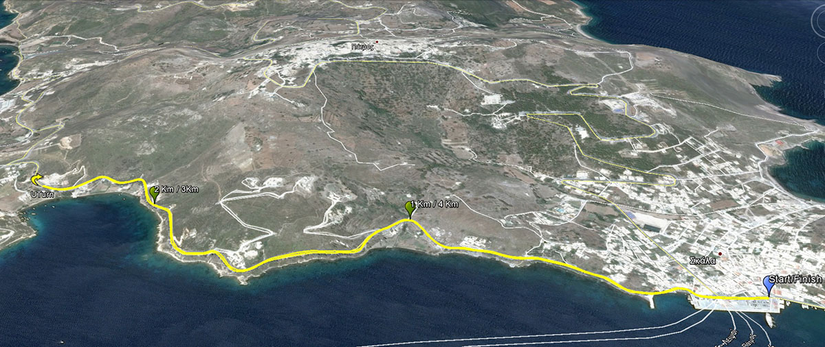 Η εκκίνηση του αγώνα 5 χλμ. θα πραγματοποιηθεί στην Σκάλα με κατεύθυνση προς τον Γροίκο. Η διαδρομή κινείται συνεχώς παραλιακά και λίγο πριν οι συμμετέχοντες μπουν στο Γρόικο κάνουν αναστροφή και επιστρέφουν στη Σκάλα από την ίδια διαδρομή.